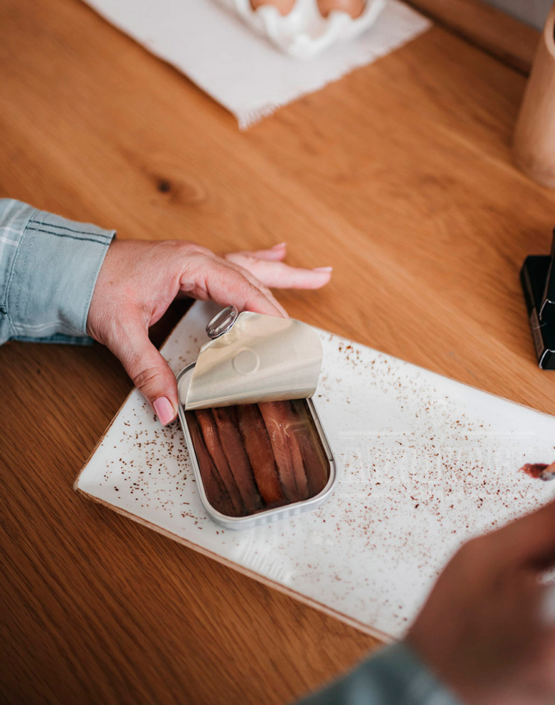 Canned anchovies, being semi-preserved, should be kept cold for as long as possible, both before opening the can of anchovies and afterwards. This is because they have not been subjected to a sterilisation process and are therefore preserved by the salt. The can of anchovies must be free of dents and rust. In case the can is swollen or releases air when opened, we would discard them because the product could be contaminated. We should also reject any tins of anchovies that have a suspicious taste or smell. Once the can of anchovies has been opened and if not all the contents have been consumed, the anchovies can be kept in the refrigerator. It is important to cover the anchovies well in olive oil so that they do not oxidise. To do this, we can store the anchovies in a tupperware container and cover them well with oil; or pour the oil into the can of anchovies itself.